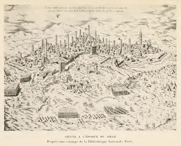 Он двинулся в Маремму, куда через некоторое время подошли алжирские корабли. Итало-французская армия, поредевшая от дезертирства, была усилена 6 тыс. свежих и хорошо экипированных солдат. Выступив к Буонконвенто, маршал соединился с 3-тыс. отрядом Биндо Альтовити, после чего повернул к Сиене. В целом, под командованием Строцци было 12 отрядов итальянской пехоты (5—6 тыс. чел.), по три тысячи французов, немцев и граубюнденцев, и 1200 итальянских кавалеристов[25]. К тому времени Мариньяно уже начал осаду города, расположив основной лагерь перед Римскими воротами. Приближение противника застало его врасплох, но Строцци отверг предложение большинства капитанов немедленно атаковать противника, пока тот не восстановил порядок[26].