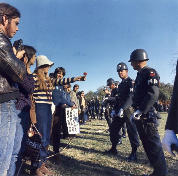 В октябре 1967 года был устроен поход на Пентагон, ещё один антивоенный митинг-спектакль[16]. Им путь преградили более 2500 солдат армии и Национальной гвардии. Демонстранты просто стояли, держа цветы, а некоторые вставляли эти цветы в стволы солдатских винтовок[17].