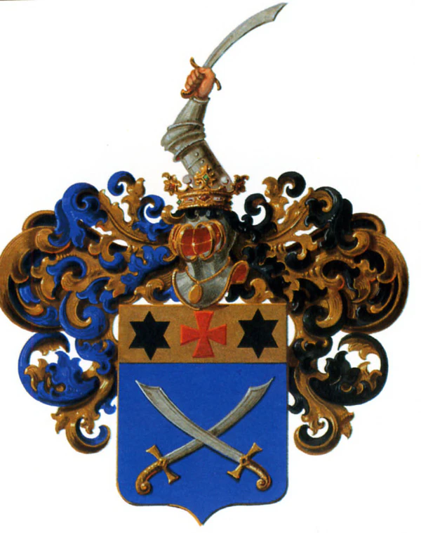 В лазоревом щите накрест два серебряных с золотыми рукоятками изогнутых меча. В золотой главе щита горизонтально две чёрные шестиконечные звезды, между ними червлёный крест с широкими концами.