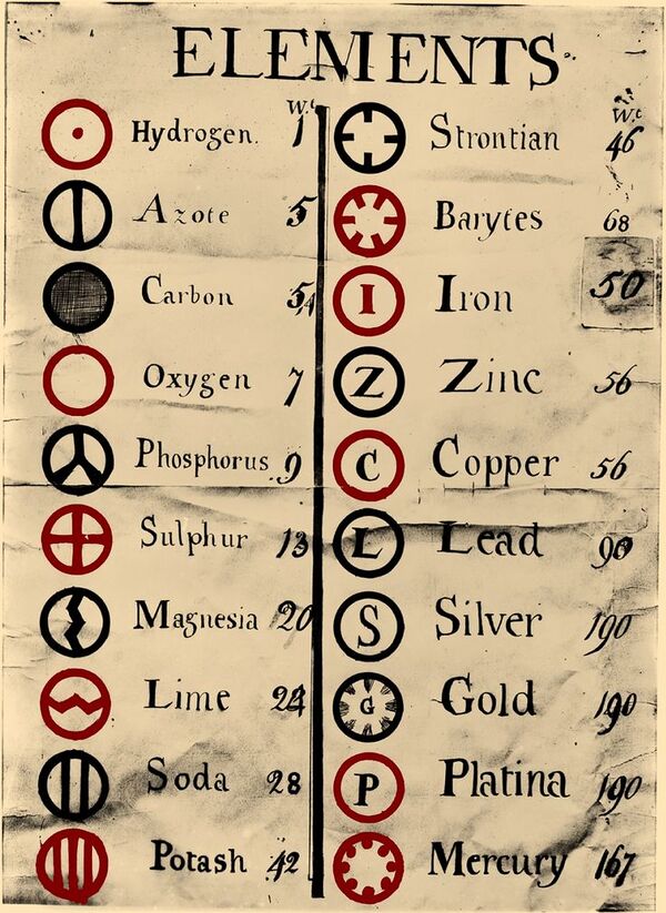 В начале XIX века английский химик Дж. Дальтон предложил обозначать атомы химических элементов кружками, внутри которых помещались точки, чёрточки, начальные буквы английских названий металлов и др.[3] Символы химических элементов Дальтона получили некоторое распространение в химической литературе, но вскоре были вытеснены новой буквенной символикой, предложенной шведским химиком Й. Я. Берцелиусом.