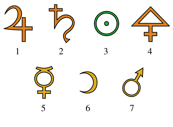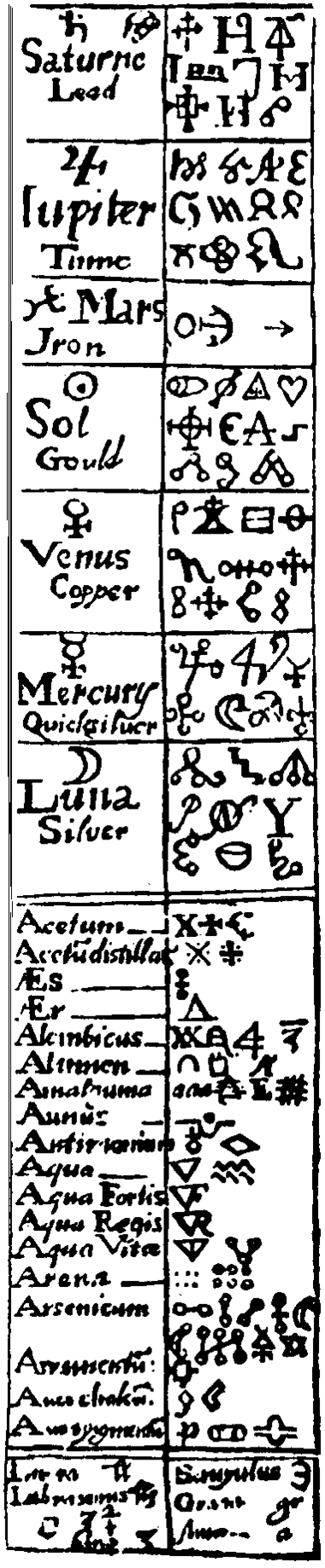 В то же время формируется символика металлов. Так, у Раймунда Луллия семь металлов, известных с древности, имеют обозначения, тождественные с астрологическими знаками семи небесных светил: Солнца (☉, золото), Луны (☽, серебро), Юпитера (♃, олово), Венеры (♀, медь), Сатурна (♄, свинец), Меркурия (☿, ртуть), Марса (♁, железо). Происхождение и смысл этих символов достоверно неизвестны. Возможно, что знак свинца должен изображать косу Сатурна, знак железа — щит и копьё Марса, знак меди — ручное зеркало Венеры и т. п.: тогда их можно рассматривать, как знаки мифологических божеств, под названиями которых были известны металлы; но одинаково вероятно, что эти знаки являются и сокращениями имён тех же божеств. У алхимиков XIV—XVI вв. встречаются и такие объяснения, что замкнутый круг есть знак совершенства металла, полукруг (полумесяц) — знак приближения его к совершенству[1].