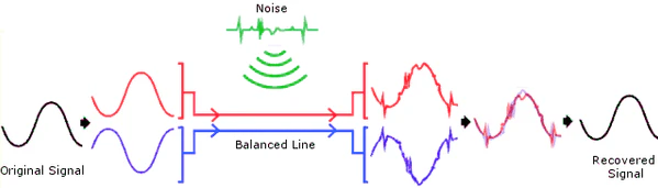 Симметричное подключение отличается от несимметричного наличием пары сигнальных проводов вместо одного в несимметричном. [2]В одном из сигнальных проводов передаётся оригинальный (неизмененный) сигнал, в другом — инвертированный (сдвинутый по фазе на 180°). Из-за использования двух идентичных проводов, расположенных в непосредственной близости друг от друга, воздействие внешних факторов на сигналы происходит практически одинаково. Впоследствии за счёт инвертирования полезного сигнала, перевернутого по фазе на 180°, он становится синфазным с полезным сигналом, приходящем изначально в фазе, а сигнал помехи, попавший на оба проводника синфазным, на одном из проводников становится противофазным, и за счет этого взаимоподавляется.