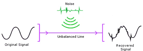 При обычном, несимметричном подключении[1] соединение происходит посредством только одного сигнального провода и одного общего провода (часто в виде экранной оплётки кабеля), по которым и передаётся сигнал. В большинстве случаев это дает приемлемый результат на небольших расстояниях, до 5-7 метров. При увеличении длины кабеля увеличивается воздействие внешних помех на сигнал, что в некоторых случаях бывает неприемлемым. Одним из решений этих проблем может быть симметричное подключение.