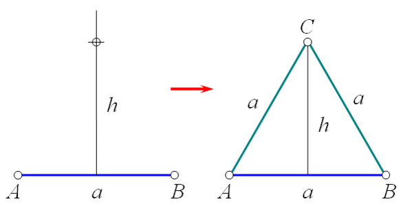 Для 1-симплекса это утверждение очевидно. Описанная 1-сфера будет представлять собой две равноудалённые от центра отрезка точки, совпадающие с концами отрезка, и её радиус будет составлять R = a/2. Добавим к 1-симплексу ещё одну точку и попробуем описать вокруг них 2-сферу.