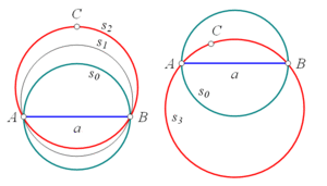 Построим 2-сферу s0 радиусом a/2 таким образом, чтобы отрезок АВ был её диаметром. Если точка С находится за пределами окружности s0, то, увеличивая радиус окружности и смещая её в сторону точки С, можно добиться того, что все три точки окажутся на окружности. Если же точка С лежит внутри окружности s0, то подогнать окружность под эту точку можно, увеличивая её радиус и смещая в сторону, противоположную точке С. Как видно из рисунка, сделать это можно в любом случае, когда точка С не лежит на одной прямой с точками А и В. Не является помехой и несимметричное расположение точки С относительно отрезка АВ.