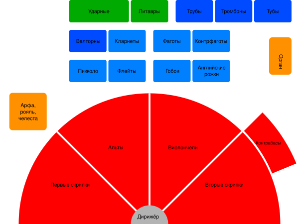 Вдоль рампы располагаются первые скрипки (слева) и виолончели (справа). Вторые скрипки сидят позади первых, альты сидят за виолончелями справа. Контрабасы находятся за спиной у виолончелей. Посередине сцены расположены два ряда деревянных духовых инструментов (флейты, гобои и кларнеты, фаготы). За ними располагаются медные инструменты — трубы, валторны, тромбоны и туба. Ударные инструменты расположены дальше всего от слушателя — от левого края до центра сцены, где обычно расположены литавры. Арфы находятся с левой стороны от дирижёра.