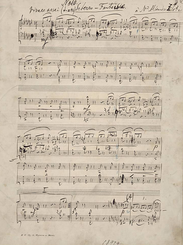 Предположение Богатырёва о первоначальном характере оркестровой версии Скерцо подтверждается также замечанием Сергея Танеева на обложке папки (в обложку № 85 вложены рукописи трёх пьес: «Scherzo-Fantaisie» № 10 (стр. 1—8), «Valse-bluette» № 11 (рус. «Вальс-безделушка», стр. 8—10) и «Echo rustique» № 12 (рус. «Сельский отзвук», стр. 11—12)) с рукописным нотным текстом произведения: «От 1—8 стр. ф-п. пьеса ор. 72, № 10 „Scherzo-Fantaisie“ переделана из скерцо, предполагавшегося для оркестра. Слова на первой стр. „Как там“ относятся к оркестровому эскизу». Доктор искусствоведения Александр Николаев отмечал, что в рукописях этой папки наиболее полно записано Скерцо, где самим композитором проставлено много нюансов. Остальные же две пьесы записаны эскизно[34][Прим 7].