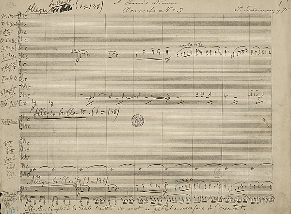Сохранился эскиз партитуры Части I Allegro brillante[Прим 9], он включает в себя экспозицию и значительную часть разработки, а также набросок этой части, предназначенный для переработки Симфонии в Третий фортепианный концерт (это — дирекцион данной части). Существует также автограф партитуры Третьего концерта для фортепиано с оркестром, который соответствует Части 1[38].