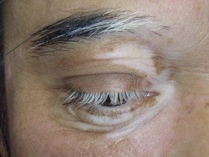 Первым симптомом обычно становится появление депигментированных участков кожи на лице, преимущественно в области щёк, висков или лба. Эти очаги чётко отграничены, не сопровождаются воспалением и болезненностью. В ряде случаев наблюдается полное или частичное побеление ресниц, бровей или волос в поражённой зоне (полиоз), которое может предшествовать кожной депигментации[1][2].