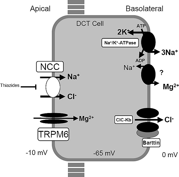 Обработка натрия, хлора, магния, кальция и калия в почках зависит от слаженной работы канальцевых транспортёров. Дистальные извитые канальцы играют ключевую роль в этом процессе. Нарушения функции этих каналов приводит к различным электролитным нарушениям.