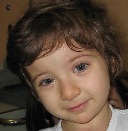 Черепно-лицевые признаки достаточно специфичны: высокий лоб с низкой линией роста волос, густые дугообразные брови, длинные ресницы, опущенные книзу глазные щели, гипертелоризм и эпикантус. Характерен крючковидный нос с загнутым книзу кончиком и широкой переносицей. Часто отмечаются высокое арковидное нёбо, узкая ротовая щель, недоразвитие верхней челюсти и своеобразная гримаса, напоминающая улыбку[5]. Ушные раковины могут быть деформированы и низко расположены[3][9].