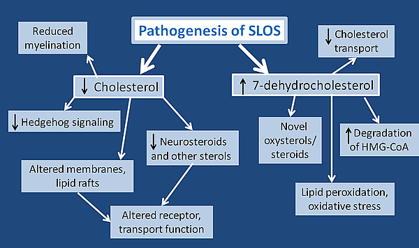 Синдром Смита — Лемли — Опица — это аутосомно-рецессивное заболевание, возникающее из-за неспособности организма синтезировать холестерин[2]. Синдром встречается редко, но проявляется тяжело, его частота составляет 1 на 10 000-70 000 новорождённых. Ошибки в эмбриогенезе возникают из-за отсутствия продукции холестерина, что приводит к дисфункции клеточной мембраны и отсутствию активации белков hedgehog, отвечающих за координацию транслокации и дифференциации. Дальнейшие осложнения возникают из-за постоянной неспособности вырабатывать холестерин и накопления предшественников холестерина[3].