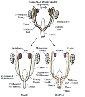 Примерно до седьмой недели развития зародыш имеет индифферентные протоки, которые состоят из двух пар протоков: мюллеровых и вольфовых[41]. Примерно в это время клетки Сертоли в яичках выделяют антимюллеров гормон, чтобы подавить развитие мюллеровых протоков и вызвать их дегенерацию[41]. Если этого не происходит, то мюллеровы протоки развиваются в женские половые органы (матка, шейка матки, фаллопиевы трубы и верхняя часть влагалища)[41]. В отличие от мюллеровых протоков, вольфовы протоки не будут развиваться по умолчанию[42]. При наличии тестостерона и функциональных андрогенных рецепторов протоки Вольфа превращаются в эпидидимис, семявыносящие протоки и семенные пузырьки[41]. Если яички не способны секретировать тестостерон или андрогенные рецепторы не функционируют должным образом, протоки Вольфа вырождаются[43].