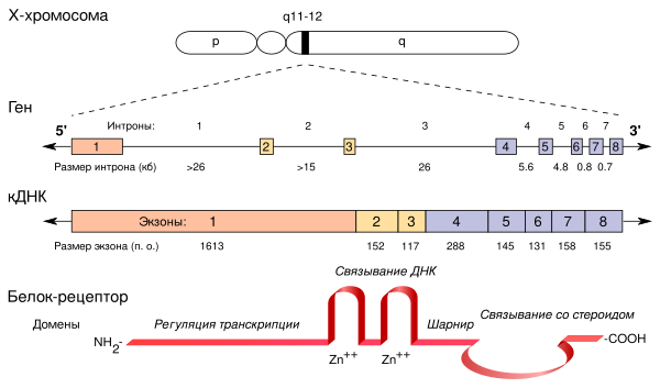 Рецептор андрогена человека (AR) представляет собой белок, кодируемый геном, расположенным на проксимальном длинном плече Х-хромосомы (локус Xq11-Xq12)[14]. Область, кодирующая белок, состоит из приблизительно 2757 нуклеотидов (919 кодонов), охватывающих восемь экзонов, обозначенных 1-8 или A-H[3][15]. Интроны различаются по размеру от 0,7 до 26 кб[15]. Как и другие ядерные рецепторы, белок AR состоит из нескольких функциональных доменов: домена трансактивации (также называемого доменом регуляции транскрипции или амино / NH2-терминальным доменом), ДНК-связывающего домена, шарнирной области и стероид-связывающего домен (также называемый карбоксильным лиганд-связывающим доменом)[3][7][15][16]. Домен трансактивации кодируется экзоном 1 и составляет более половины белка AR[15]. Экзоны 2 и 3 кодируют ДНК-связывающий домен, тогда как 5'-часть экзона 4 кодирует шарнирную область[15]. Остальная часть экзонов с 4 по 8 кодирует лиганд-связывающий домен[15].