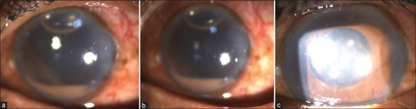 - Биомикроскопия — тотальный отёк роговицы, складки десцеметовой оболочки, воспалительные клетки в передней камере или гипопион, преципитаты на эндотелии; на поверхности интраокулярной линзы и в передней камере видны нити фибрина.