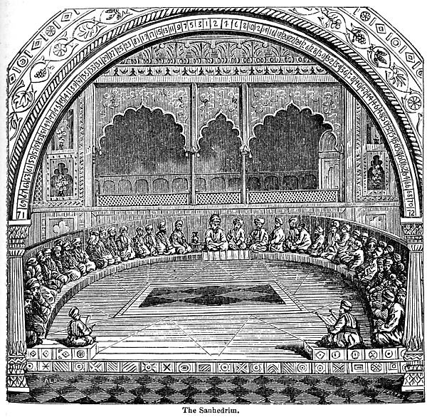 В Иерусалиме существовал также Великий Синедрион — высшее государственное учреждение (совет) и высший судебный институт иудеев, состоявший из 71 члена[9]. По своему составу Синедрион представлял собой вид аристократического сената, члены которого назначались, по-видимому, кооптацией из учеников членов Синедриона, членами могли являться кохены, левиты или евреи с родословной. Прозелиты не допускались[10]. Член Синедриона не должен был также обладать увечьями, помимо Торы обязательно было знание языков, основ наук и ремёсел, а также обычаев астрологов и колдунов[11] Председателем Синедриона был наси (נשיא), созывавший собрания, им мог быть первосвященник. Местом собрания был особый зал (לשכת הגזית — «зал из тёсаных камней»)[12] при иерусалимском Храме[13], но в особенных и крайних случаях собирались в доме наси[14]. Места заседавших располагались в виде полуокружности, чтобы председательствующий мог видеть всех[15].