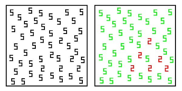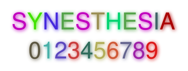 В одной из широко распространённых форм синестезии, известной как графемно-цветовая или цвето-графемная, цифры или буквы воспринимаются окрашенными[9][10]. В пространственной форме синестезии, или синестезии числовой линии, числа, годы, месяцы, и/или дни недели представляются расположенными в определённом месте пространства (например, 1980 может быть «дальше», чем 1990), или могут появляться в форме трёхмерной карты (например, расположенные по часовой стрелке или против неё)[11][12].