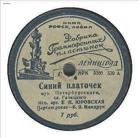 В августе 1942 года в студии выпускавшей гибкие диски московской Экспериментальной фабрики грампластинок (главный столичный производитель пластинок — Апрелевский завод — был в то время в эвакуации) Русланова записала четыре песни, в том числе «Синий платочек», который она с апреля исполняла на фронтах перед бойцами. В стихах Якова Галицкого было изменено окончание, звучавшее теперь так: