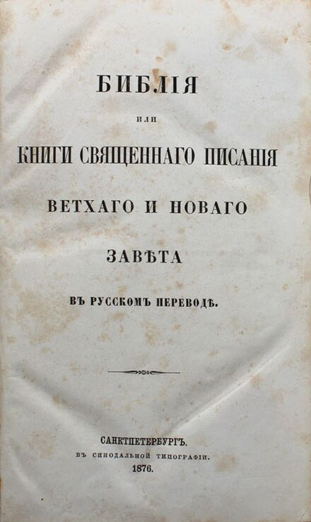 Ветхозаветная часть русского перевода издавалась частями: в 1868 году было издано «Пятикнижие Моисея», в 1869 г. — исторические книги; в 1872 г. — учительные книги; в 1875 г.— пророческие[24], а в 1876 году был издан полный перевод[19]. Перевод канонических книг делался на основе масоретского текста, но включал (в скобках) фрагменты, содержащиеся только в Септуагинте. Все неканонические книги были переведены с греческого текста, за исключением 3-й книги Ездры, переведённой с латинского[25].