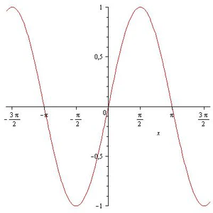 Функция синуса имеет вид: . Её графиком является непрерывная кривая с периодом . Пересечения с осью — точки ; они же — точки перегиба с углом наклона к оси ; экстремумы — .