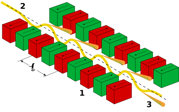 Третье поколение в качестве излучателей использует не поворотные магниты, а специальные вставные устройства: вигглеры и ондуляторы — элементы, генерирующие сильное переменное магнитное поле, и при попадании внутрь них пучка электронов — синхротронное излучение высокой спектральной яркости. Такие накопительные кольца поддерживают возможность непрерывной инжекции электронов в пучок, что позволяет поддерживать его ток стабильным практически неограниченное время[17][16].