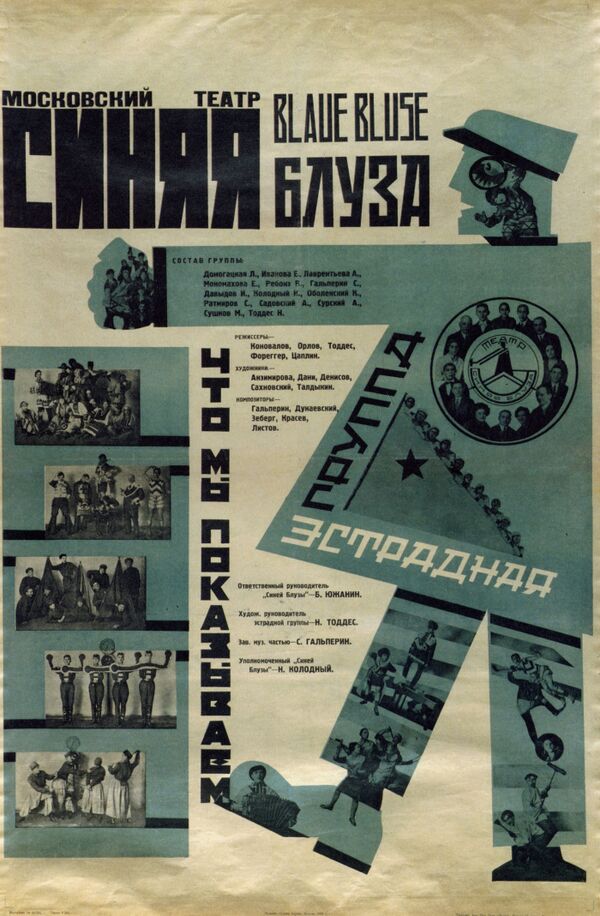 Первый коллектив под названием «Синяя блуза» был организован в 1923 году в Московском институте журналистики на базе «живой газеты». Инициатор движения, его создатель, автор и один из исполнителей — Борис Южанин. Очень скоро аналогичные группы возникли и в других городах, послужив основой создания ряда профессиональных театров и дав толчок поискам новых форм театра и эстрадных представлений. «Синяя блуза» породила тысячи последователей. Уже через 5 лет по типу «Синей блузы» в СССР работает 7000 подобных коллективов, профессиональных и, в основном, самодеятельных[5]. Их репертуар состоял из литературно-художественных монтажей, обозрений, сценок, отражавших производственную и общественную жизнь, международные события. Тематика была злободневна, в ней сочетались героика и патетика, сатира и юмор[6]. Первоначально театр состоял из трёх групп, а в зимне-осенний сезон 1929-1930 годов в нём было 12 групп артистов: основная, центральная, базовая, мюзик-холльная, эстрадная, индустриальная, оперативная, производственная, концертная, десятая, областная, экспериментальная. Каждая — со своим репертуаром[7].