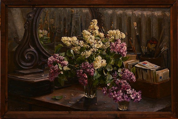 Композиция натюрморта построена вокруг старинного деревянного стола, на котором размещены букеты сирени в стеклянной вазе и стакане. Справа от цветов находится ящик с письмами, а также деревянный стакан с кистями и шпателем. Значимым элементом выступает большое круглое зеркало, отражающее часть предметов и углубляющее пространство композиции. Фон представлен как фрагмент интерьера без подробной прорисовки, что акцентирует внимание на предметах переднего плана. В работе преобладают коричневые и серые тона, дополненные акцентами розово-сиреневого, белого и зелёного цветов, что формирует гармоничный колорит.