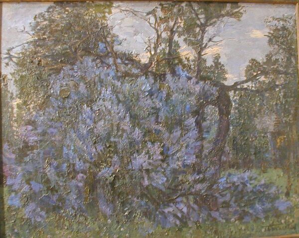 На переднем плане картины изображена узкая полоса зелени, за которой возвышается крупный куст цветущей сирени. Позади куста располагаются высокие деревья, между которыми справа в глубине просматриваются окна деревенского дома. Небо выполнено в серовато-сиреневатых тонах, подчёркивающих спокойную цветовую гамму композиции.