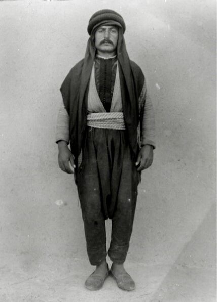 Селяне-мужчины носят длинную, до пят полосатую рубаху — кунбаз, или короткую рубаху с широкими шароварами, сужающимися ниже колен. Бедуины носят длинную широкую рубаху, распашной кафтан, часто украшающийся позументом. Головным убором селян (как кочевников, так и оседлых), а реже — и горожан является куфия, она же арафатка — белый или клетчатый головной плат, сложенный по диагонали и закрепляющийся икалем (местное название — укаль) — толстым шерстяным шнуром тёмных цветов. Как правило, укаль обвивается вокруг головы два раза, у богачей встречаются тройные укали, затканные золотой нитью.