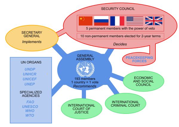 Главным органом системы ООН является сама Организация Объединенных Наций. Она состоит из шести главных органов, учрежденных Уставом Организации Объединенных Наций[3]: