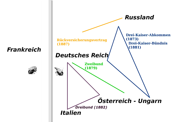 Первым шагом в этом направлении стал «Союз трёх императоров», заключенный между Австро-Венгрией, Россией и Германской империей в 1873 году. В первую очередь, это соглашение должно было обеспечить мир между тремя державами; для Германии было важно то, что Россия воздерживалась от союза с Францией. Для Бисмарка это было решающим, поскольку позволяло избежать войны на два фронта.