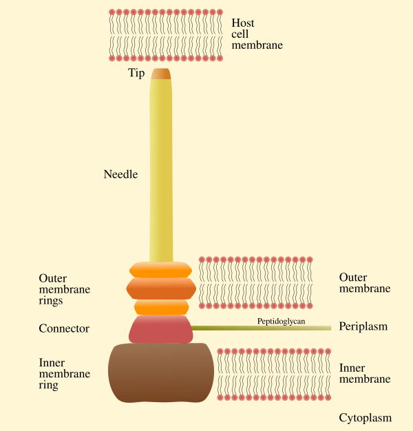 У патогенных бактерий иглоподобная структура используется в качестве сенсорного зонда для обнаружения присутствия клеток эукариотических организмов и выделения белков, которые помогают бактериям инфицировать их. Секретируемые эффекторные белки поступают непосредственно из бактериальной клетки в эукариотическую клетку (клетку-хозяина)[2], где они оказывают ряд эффектов, которые помогают возбудителю выжить и избежать иммунного ответа.