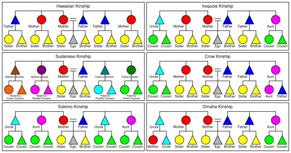 В этнологии все существующие системы терминов родства подразделяются на шесть основных типов: эскимосский, гавайский, ирокезский, кроу, омаха и суданский. В основу этой классификации положена терминологическая трактовка сиблингов (братьев и сестёр) родителей, а также родных и боковых родственников одного поколения с EGO (родные и двоюродные братья и сёстры).