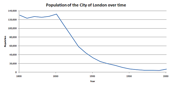 По данным, опубликованным Office for National Statistics, в 2011 году в Сити проживало около 7 000 человек;[45] примерно столько же проживало во время переписи в 2001 году.[46] В 2001 году этнические группы в составе населения распределялись так: 84,6 % — белые, 6,8 % — индо-пакистанцы, 2,6 % — чернокожие, 2,3 % — смешанные расы, 2,0 % — китайцы и 1,7 % — остальные группы.[46] Справа представлен график численности населения Сити с 1801 года на основе десятилетних переписей. В первой половине XIX века численность стабильно держится на уровне 120 000—140 000 человек, однако она резко снизилась с 1851 по 1991 год и лишь немного возросла между 1991 и 2001 годом. Единственное заметное изменение с 1801 года произошло в 1994 году.