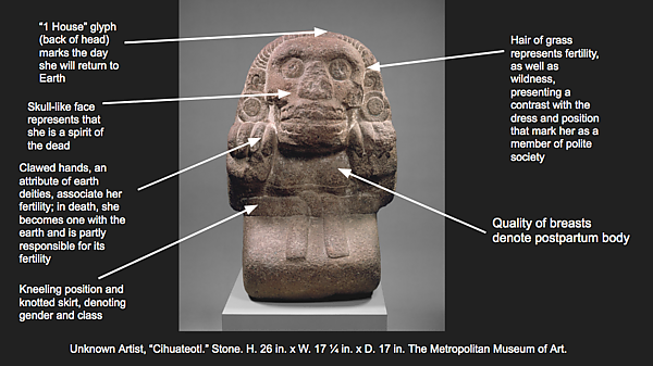 Сидя со спрятанными под юбками когтистыми ступнями, они кажутся одновременно спокойными и готовыми к нападению. В ацтекском искусстве послеродовое женское тело часто изображалось с обвисшей грудью и складками на животе. Сиуатетео же обычно изображались с подтянутым животом, обнажённой грудью и выступающими сосками. Все эти особенности подчёркивают их нереализованный материнский потенциал, ведь эти женщины умерли, так и не успев родить и вырастить своего новорождённого ребёнка[5].