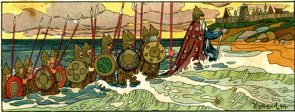 Новый корабль. То же опять. Тот же разговор у Султана. Царь опять хочет ехать. „Что это за чудо, — говорит опять мачеха, — вот что чудо: за морем стоит гора, и на горе два борова, боровы грызутся, а меж ими сыплется золото да серебро“ и проч. Третий корабль и проч. так же. „Что за чудо, а вот чудо: из моря выходят 30 отроков точь-в-точь равны и голосом и волосом, и лицом и ростом, а выходят они из моря только на один час“.