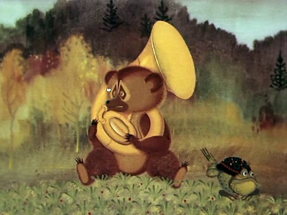 Тогда жаба начала звать на помощь медведя, играющего на трубе, и наговорила ему, что комары хотят попортить ему шкуру, и медведь начал ужасно громко играть на трубе, чтобы прогнать комариков, хотя Комар Комарович был не из робких, и сам начал гнать медведя с болота.
