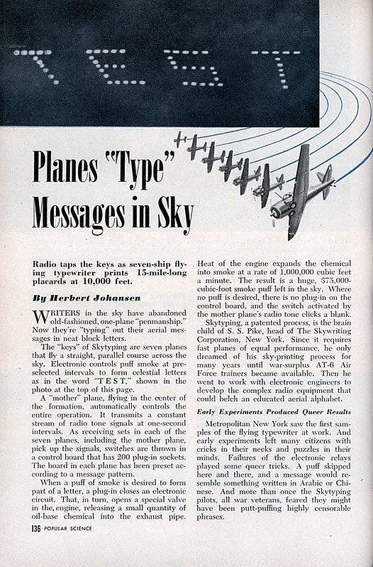 Технология скайтайпинга в США обрела популярность в качестве одного из рекламных инструментов — буквы и надписи, создаваемые таким образом, привлекают много внимания и видны большому количеству людей даже за один проход самолётов[3].