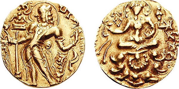Скандагупта в надписях в Джунагадхе описывается как тот, кто одарён богиней богатства и роскоши Шри-Лакшми. Эта тема находит отражение на его монетах. Монеты изображают победного царя с луком и стрелами и его божественную супругу Шри-Лакшми с лотосом в левой руке, которая считалась его второй женой. Здесь же изображён мифический ястреб, который символизировал победы царей династии Гуптов над гуннами. Скандагупта чеканил четыре вида золотых монет[3].