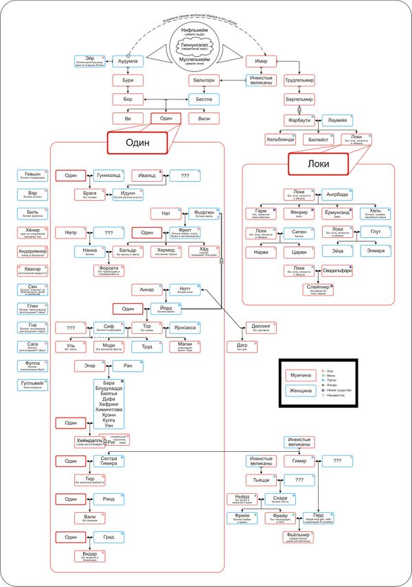 Сотворив мир, Один и его братья задумали его населить. На берегу моря они нашли два дерева: ясень и ольху (по другим источникам — иву). Из ясеня сделали мужчину, а из ольхи — женщину.