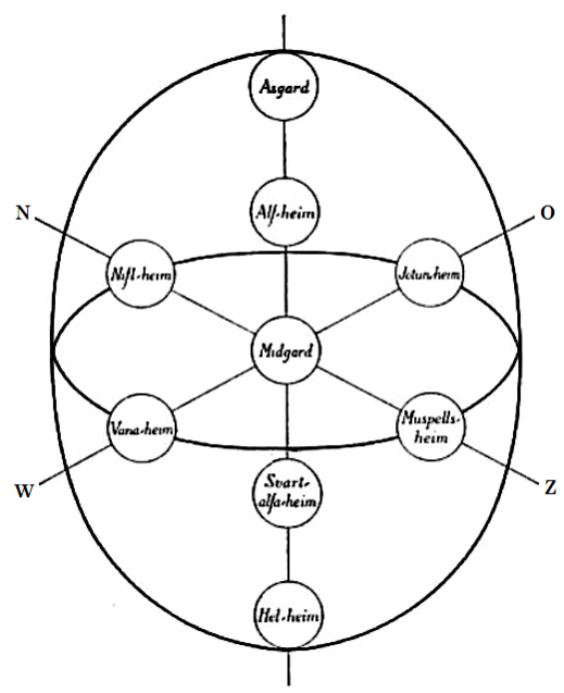 Пространственная структура мира имеет «горизонтальную» и «вертикальную» составляющие. Горизонтальная проекция противопоставляет центральный мир, населённый людьми (Мидгард-земля), окраинным землям (Йотунхейму на востоке, Нифльхейму на севере, Муспельхейму на юге и Ванахейму на западе). Вокруг земли расположен Океан, где живёт мировой змей Ёрмунганд.