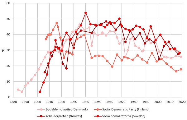 - Высокий процент рабочих, входящих в профсоюзы. В 2010 году членами профсоюза были 69,9 % рабочих в Финляндии, 68,3 % в Швеции, и 54,8 % в Норвегии. Для сравнения членство в профсоюзах составляет 12,9 % в Мексике и 11,3 % в США[11];