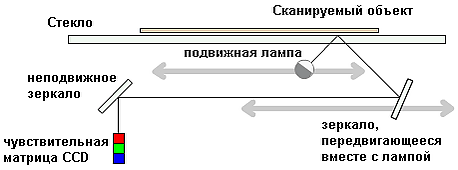 Принцип работы однопроходного планшетного сканера состоит в том, что вдоль сканируемого изображения, расположенного на прозрачном неподвижном стекле, движется сканирующая каретка с источником света. Отражённый свет через оптическую систему сканера (состоящую из объектива и зеркал или призмы) попадает на 3 расположенных параллельно друг другу фоточувствительных полупроводниковых элемента на основе ПЗС, каждый из которых принимает информацию о компонентах изображения.