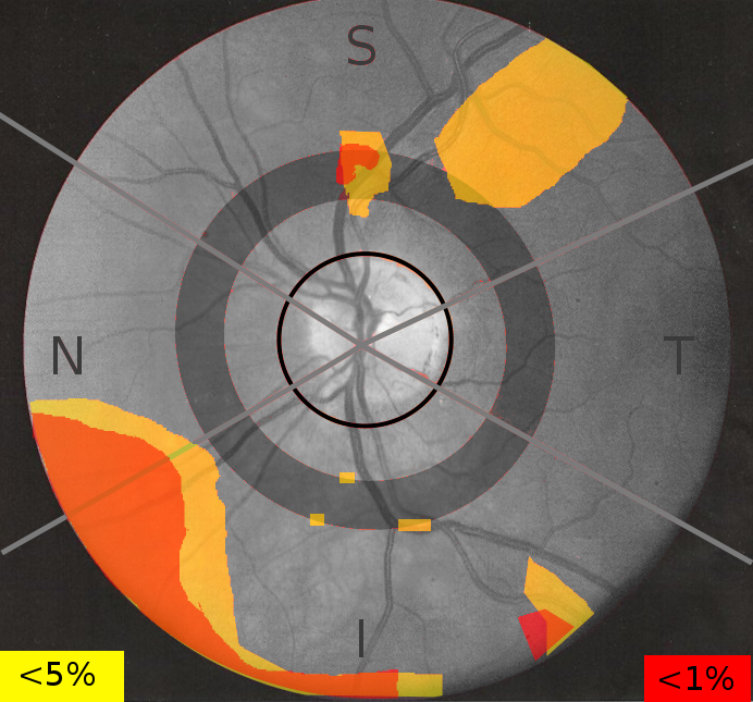 Для здорового глаза, изображение будет иметь жёлтый и красный цвет в верхних и низних участках NFL. Но, при глаукоме, на изображении будет отсутствие красного и жёлтого цветов. Сверху и снизу более равномерный синий внешний вид. Изображение показывает, что глаз на поздней стадии заболевания.