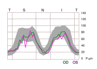 Дополнительное представление даёт TSNIT график. TSNIT строится по принципу височный-верхний - носовой - нижний-височный. Этот график отображает значения толщины по расчётным кругом от Т до S, N и обратно на Т. Площадь нормальных значений заштрихована. Измерения для левого глаза помечены "ОS", а для правого глаза "OD". Дефект указывается, если измеренное значение падает ниже затенённой области.