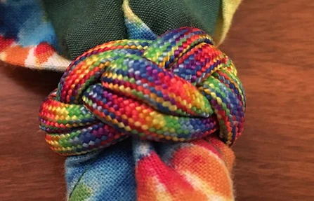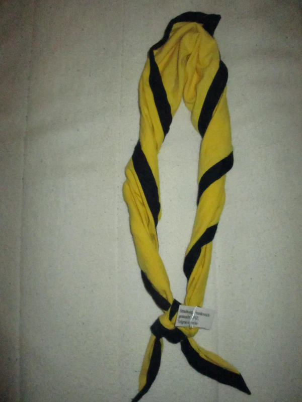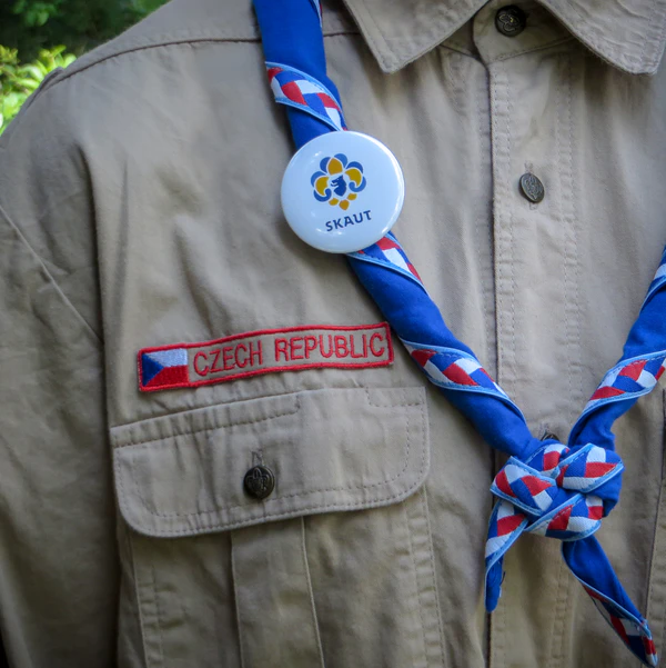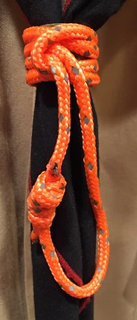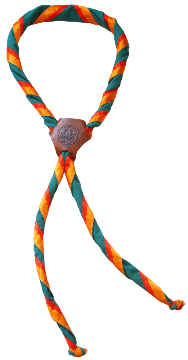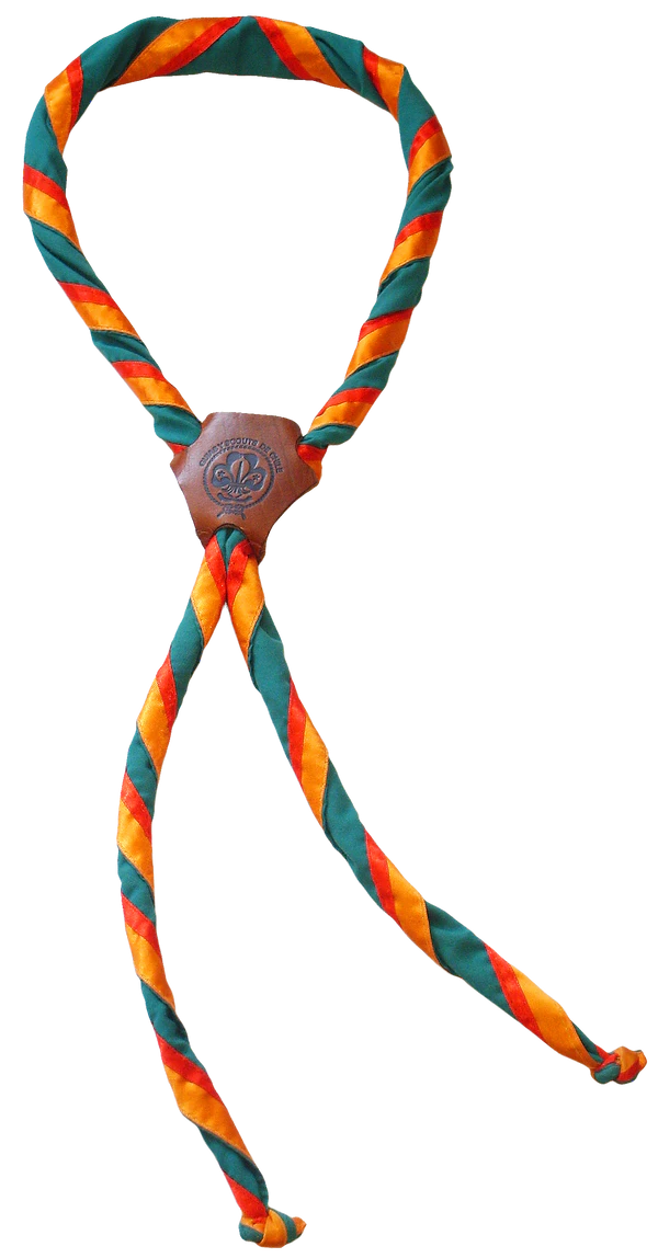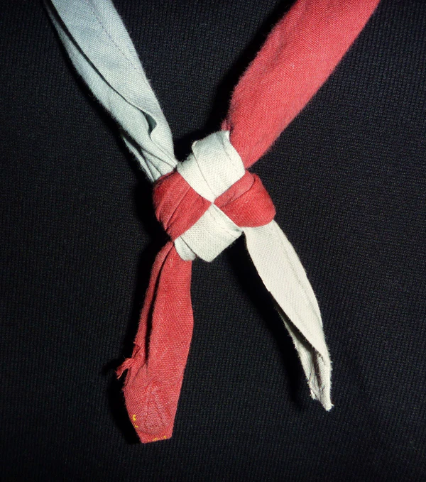 Галстук — обязателен и является отличающим элементом для каждой скаутской группы; по цвету они могут быть разнообразными в зависимости от организации, пола, звания, могут иметь цвета флага, герба города, региона, страны. Скаутский галстук закрепляется зажимом, который скаут делает сам из кожи, дерева, коры или других природных материалов, либо особым, так называемым «квадратным» узлом[31][32][33]. В отличие, например, от пионерского галстука времён СССР, скаутская традиция позволяет использование галстука в самых разных целях: перевязать рану, снять горячий котелок с костра, натянуть верёвку на переправе можно, защитив ладонь галстуком.