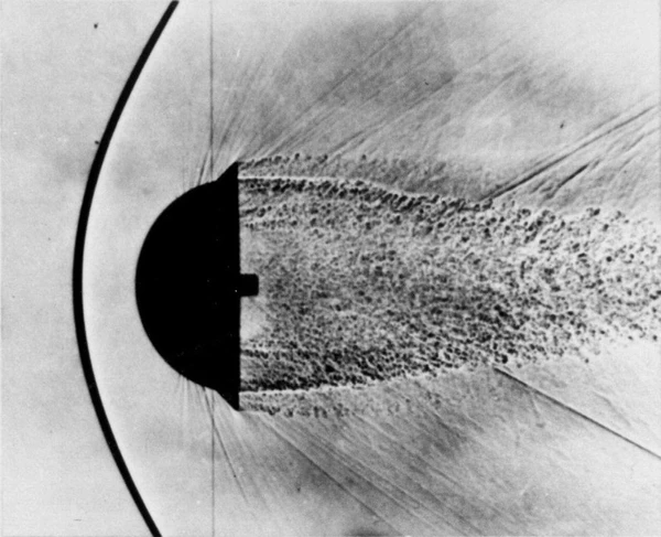 При сверхзвуковом обтекании сильно заострённых тел на их острой передней кромке возникает присоединённый скачок уплотнения[4][5]. Также присоединённый скачок уплотнения возникает и на хвостовой части тел, обтекаемых сверхзвуковым потоком (хвостовой скачок).