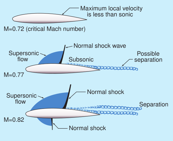 Обтекая тела, поток газа изменяет свою скорость: в некоторых точках разгоняется, а в некоторых — тормозится. Таким образом, поток с достаточно большой дозвуковой скоростью, обтекая некое тело, может вблизи некоторой его точки стать сверхзвуковым. Число Маха невозмущённого потока, при котором происходит такое явление, называется критическим числом Маха. Так как за телом поток остаётся дозвуковым, то неизбежно в некоторой другой точке вблизи тела должно произойти его торможение. Таким образом, вблизи тела возникают один или более скачков уплотнения. Если пограничный слой вблизи тела — везде турбулентный, то торможение местного сверхзвукового течения происходит на одном прямом скачке уплотнения. Если за точкой перехода течения из дозвукового в сверхзвуковое находится точка перехода ламинарного пограничного слоя в турбулентный, то в этой точке возникнет косой скачок уплотнения, за которым может последовать прямой[15].