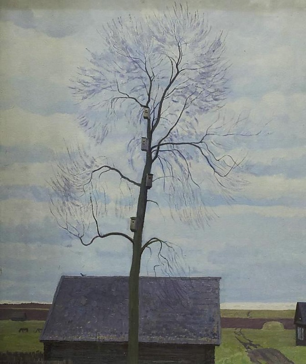 На картине изображена деревенская околица. В центре композиции на переднем плане выделяется высокое дерево, занимающее почти всю высоту холста на фоне дома. На его ветвях размещены четыре скворечника, что подчёркивает мотивы сельской жизни и взаимодействия человека с природой.