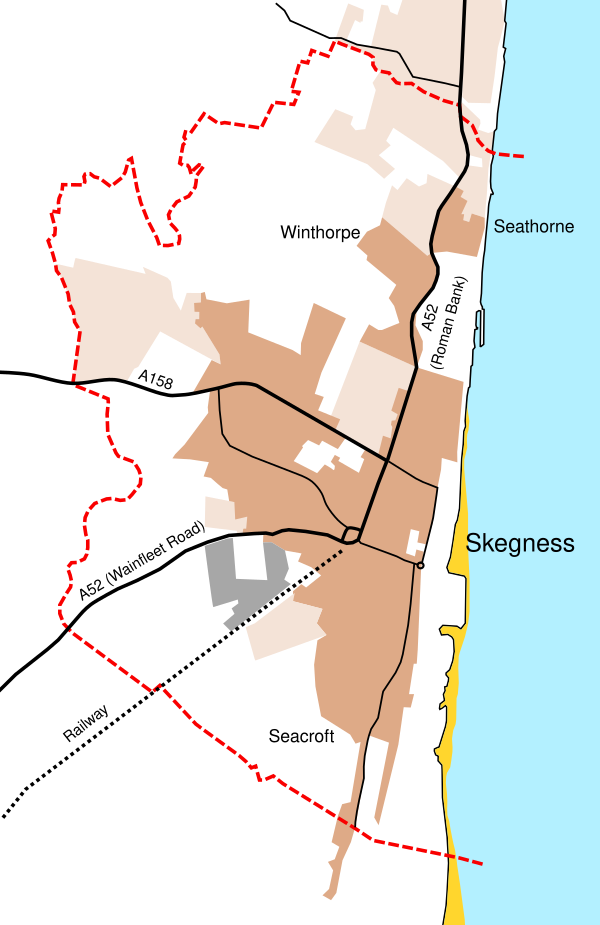 Гражданская община Скегнесса включает районы Сикрофт на юге, деревню Уинторп и пригород Ситорн на севере. Город граничит с общинами Инголдмеллс на севере, Эддлторп на северо-западе, Бёрг-ле-Марш на западе и Крофт на юге[21]. Скегнесс расположен на низинной равнине Линкольн Марш вдоль побережья Северного моря. Большая часть территории находится на уровне моря, лишь узкая полоса вдоль побережья возвышается на 4–6 метров[22]. Геологически основание города составляют меловые породы, а поверхностные отложения представлены глиной, илом и песком[23].